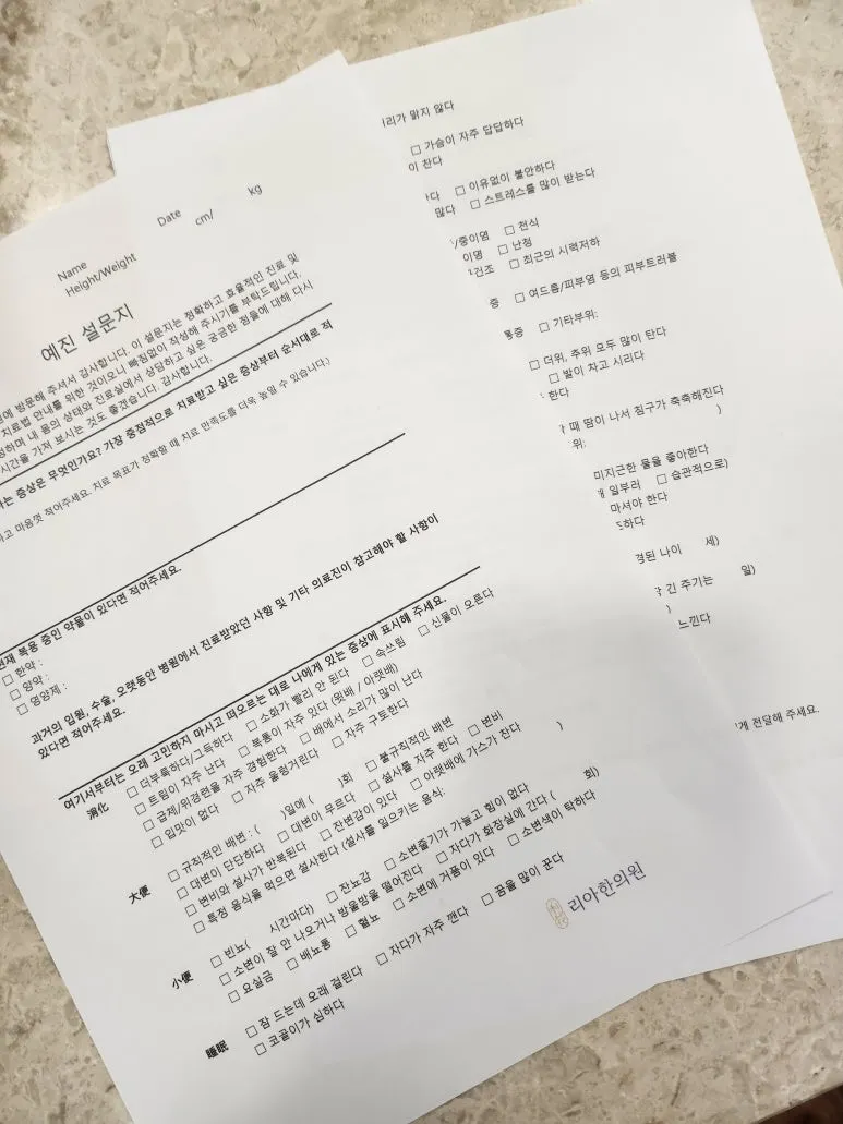 그 다음 진료 전 현재 신체적, 정신적 건강상태를 자세히 체크하기 위한 설문지를 시행하게 되구요. 필요한 경우 불안이나 우울감, 공황장애 척도 등에 따라 심리검사를 시행하기도 합니다.