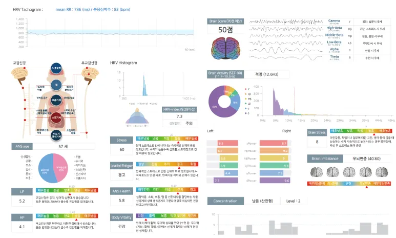 검사를 하시면 다음과 같이 나오게 됩니다. 내 몸의 스트레스 상태, 뇌파의 분포, 피로도, 신체적 활력도, 자율신경계 건강나이, 교감신경과 부교감신경의 비율 등을 확인하실 수 있게 됩니다.
